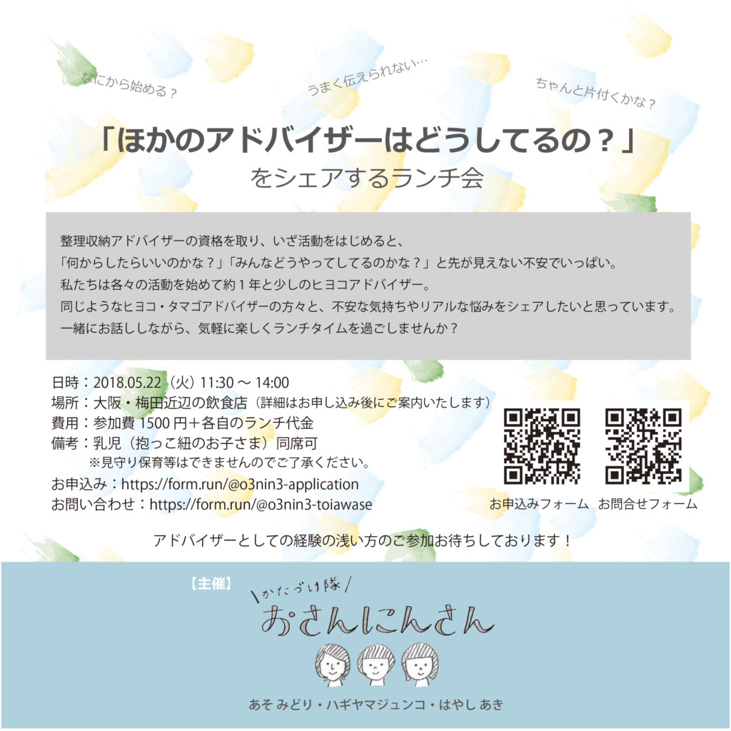 日時:2018.05.22(火) 11:30~14:00 場所:大阪・梅田近辺の飲食店 (詳細はお申し込み後にご案内いたします) 費用:参加費1500円+各自のランチ代金 備考:乳児(抱っこ紐のお子様)同席可 ※見守り保育等はできませんのでご了承ください。