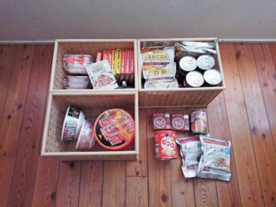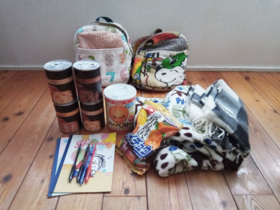 長期保存のパン、お菓子、ノートとペン、ブランケット。