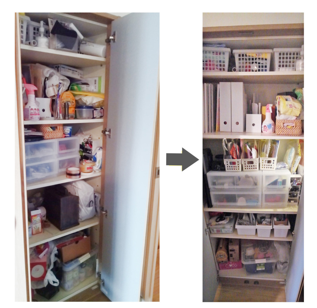 奥の壁が斜めになっていて、物を入れ替えるとうまく入らないこともあり、もとの収納場所を活かしつつ、収納しなおしました。