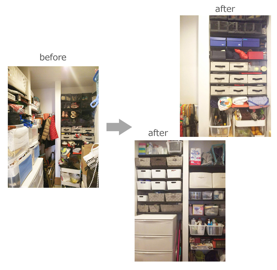 リビングダイニングそばの便利な場所にあり、ものがどんどん集まってくるので、オンシーズンのお洋服だけにするなど数を絞るアドバイスさせていただきました。