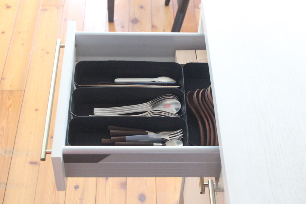 文房具やカトラリー・キッチンツールなどの小さなものは、中で動いてしまうので、混じってしまわないように仕切ります。