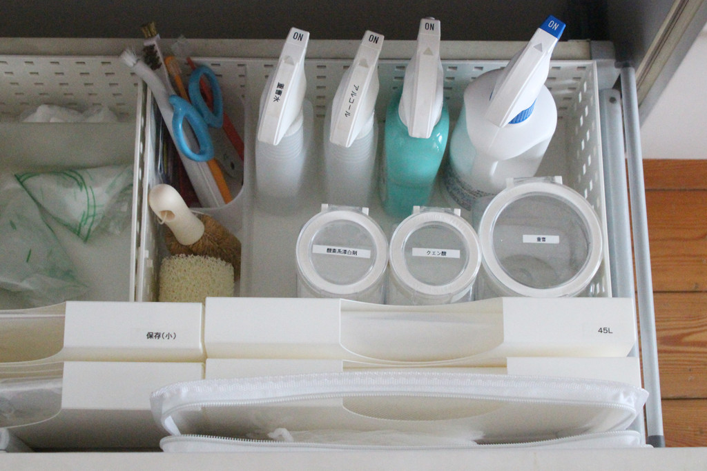 容器に入ったものは上から見て把握できるよう、フタを透明にしたり、上から見てわかるようラベリングします。