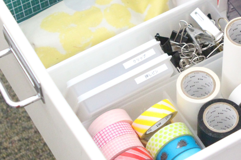 ゼムクリップと押しピンは小さなケースに入れ、何が入っているかわかるようにラベリングして、立てて収納しています。