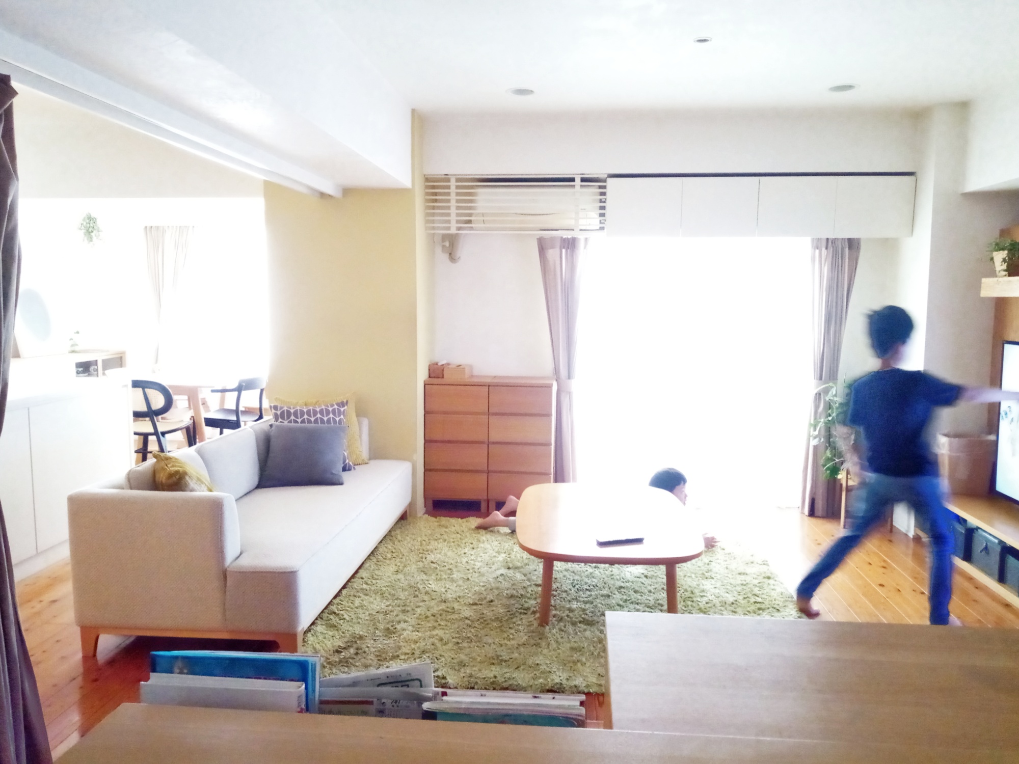「もうちょい静かに遊んで…ソファ新しいからもっと大事に扱って…」