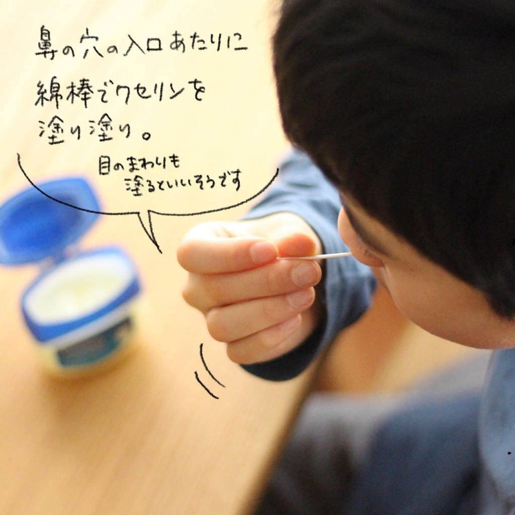 鼻の穴の入り口あたりに、綿棒でワセリンを塗ります。