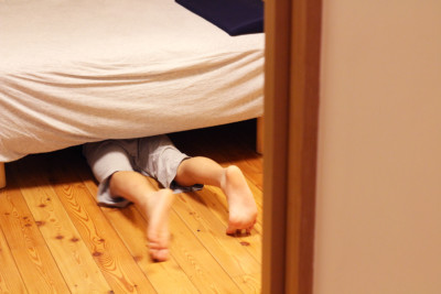 息子がベッドの下を拭き掃除しています。スッポリ入れるの便利!