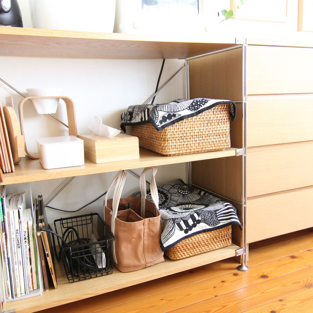出しっぱなしだと散らかった印象になりますが、カゴやボックスに入れるだけでスッキリ見えます。