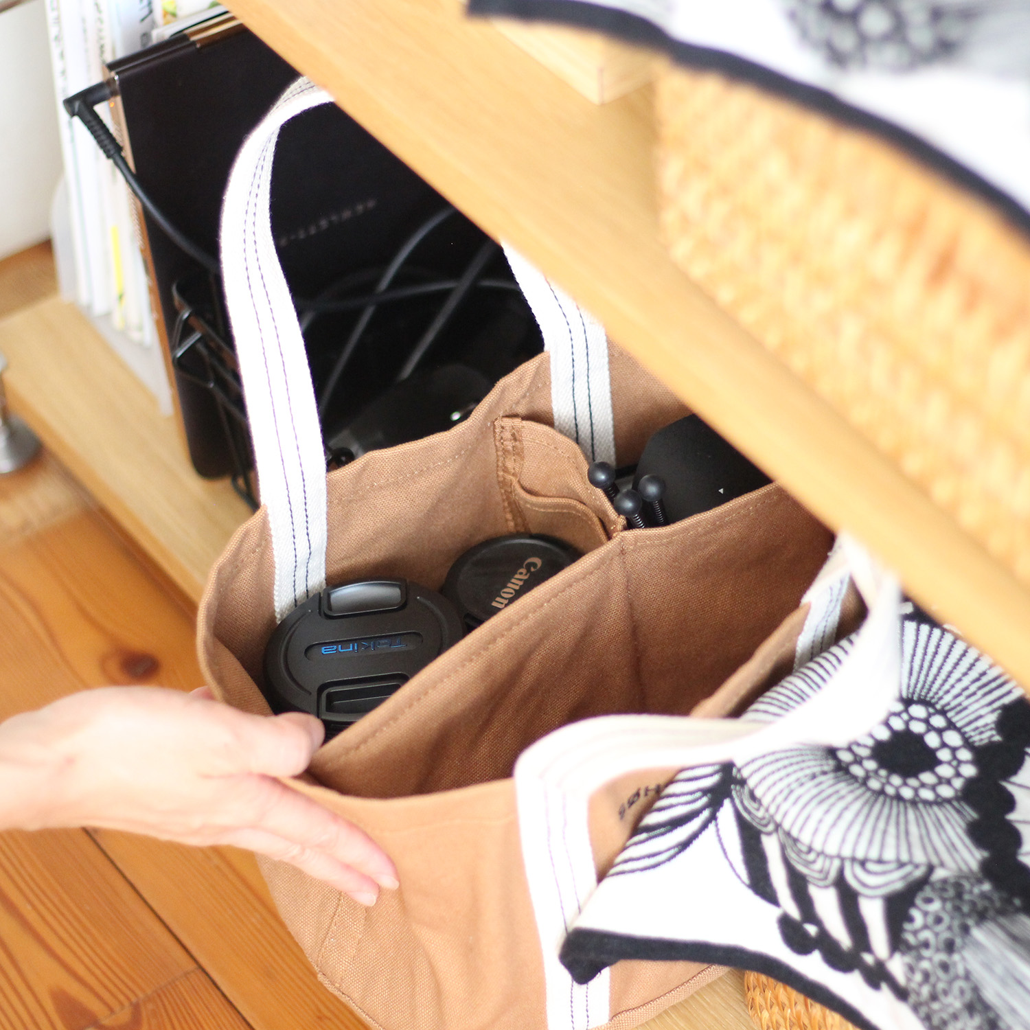 下段の真ん中には、ここで使うことが多いカメラやレンズ入れとしてトートバッグを使っています。