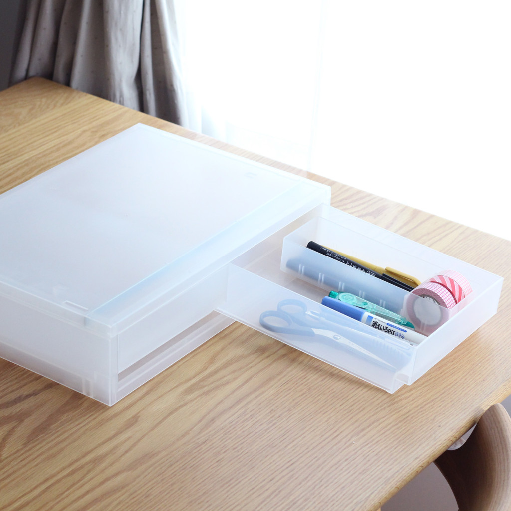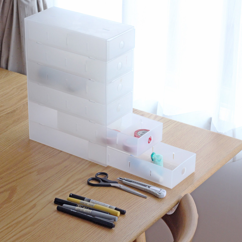文具をあれこれ入れたくなるのですが、ペン/はさみ/テープ/と細かく分けて入れると、あれこれ使ったあと元に戻す際に引き出しを全部開けなければならず、しまうのがおっくうに…